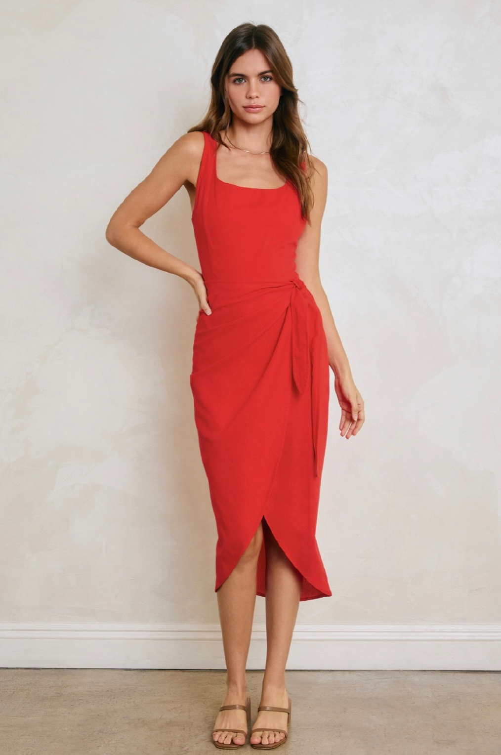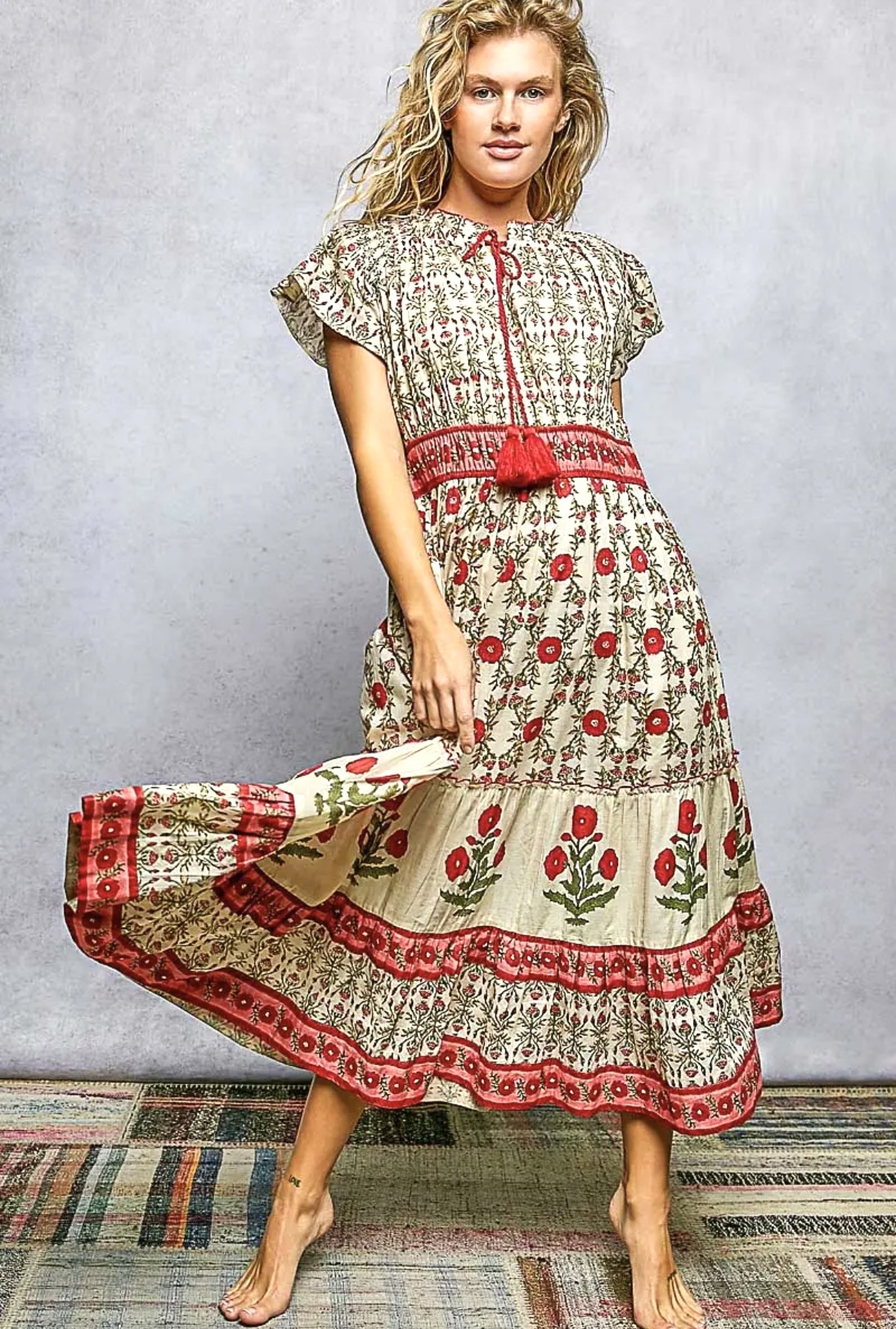 Red multi midi dress that offers a captivating print in a bold passionate palette.