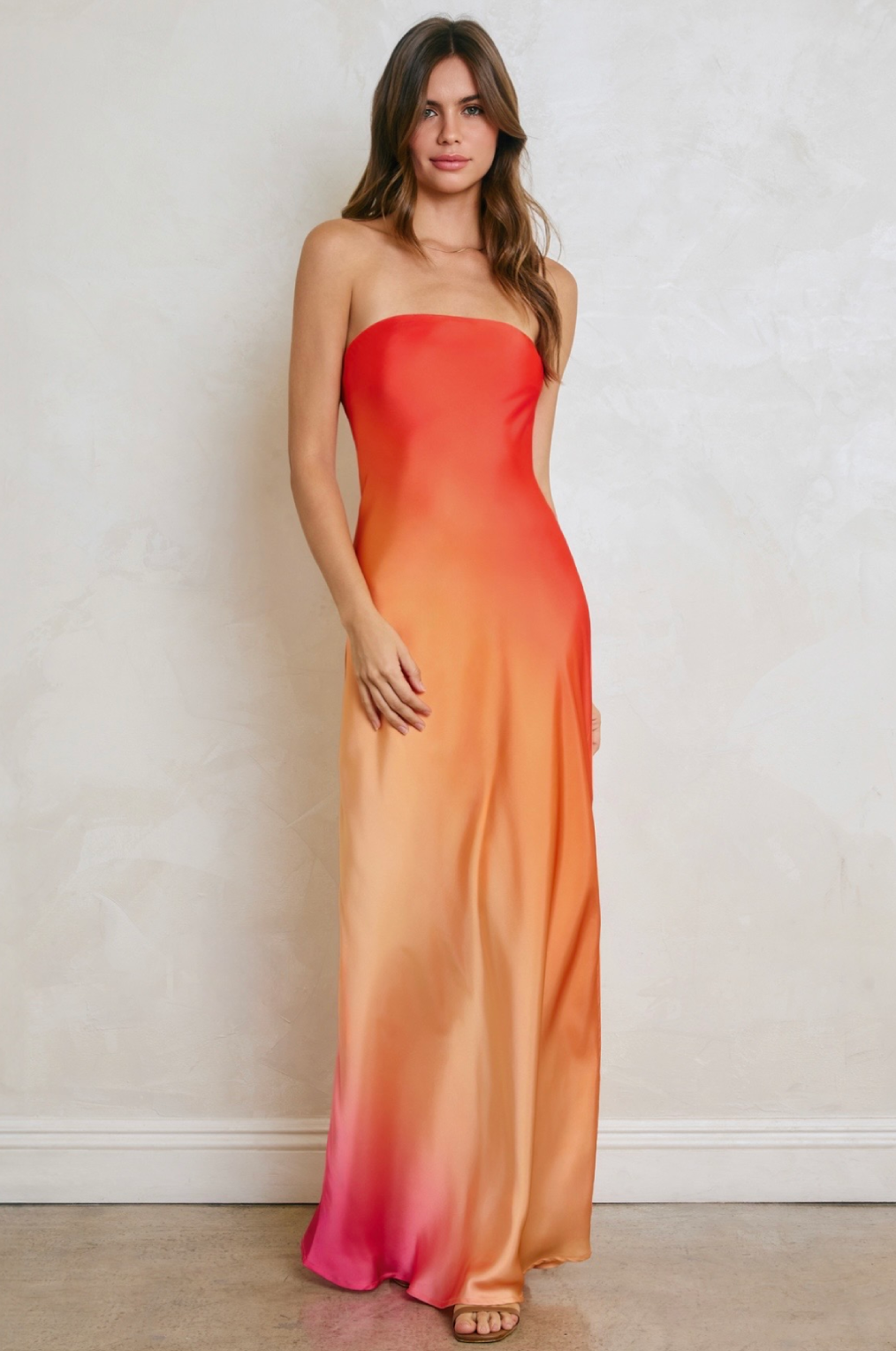 Ombre print satin strapless maxi dress. Elastic band with gel grip tape on the neck line. Hidden side, zipper closure. Shell and lining 100% polyester.
