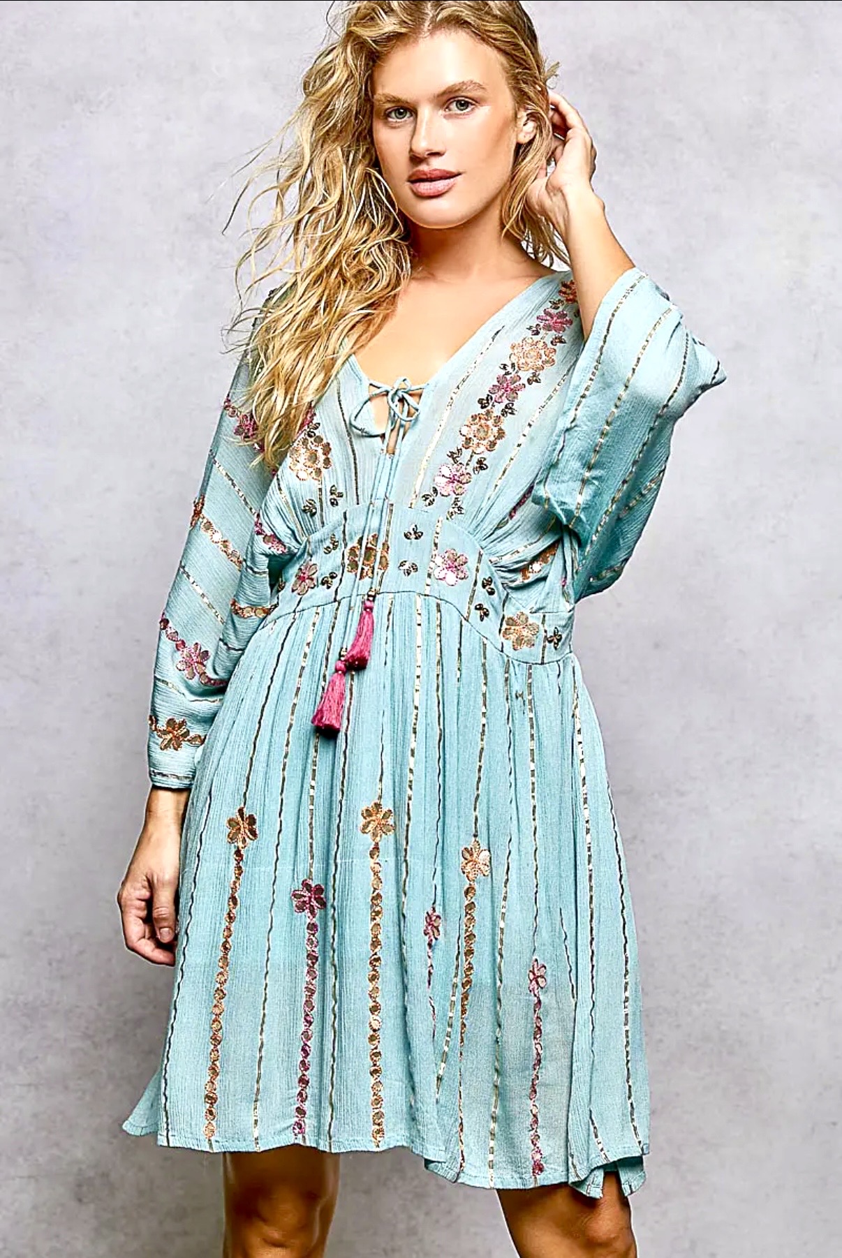 V-neck, short dress designed in a fluid flow silhouette, featuring three-quarter length sleeves. The dress is adorned with glinting embroidery delicately stitched using lustrous threads.