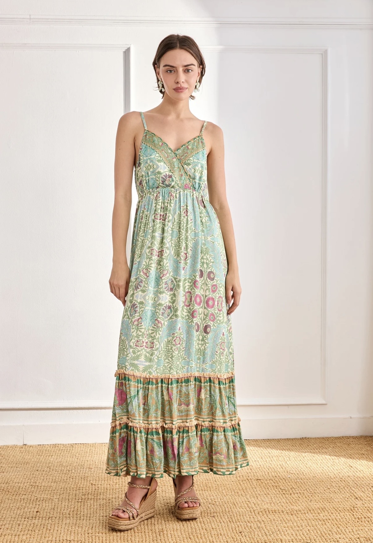 Long floral print dress. Crossover v- neck and adjustable spaghetti straps. Sequin detail on ribbon trimming.