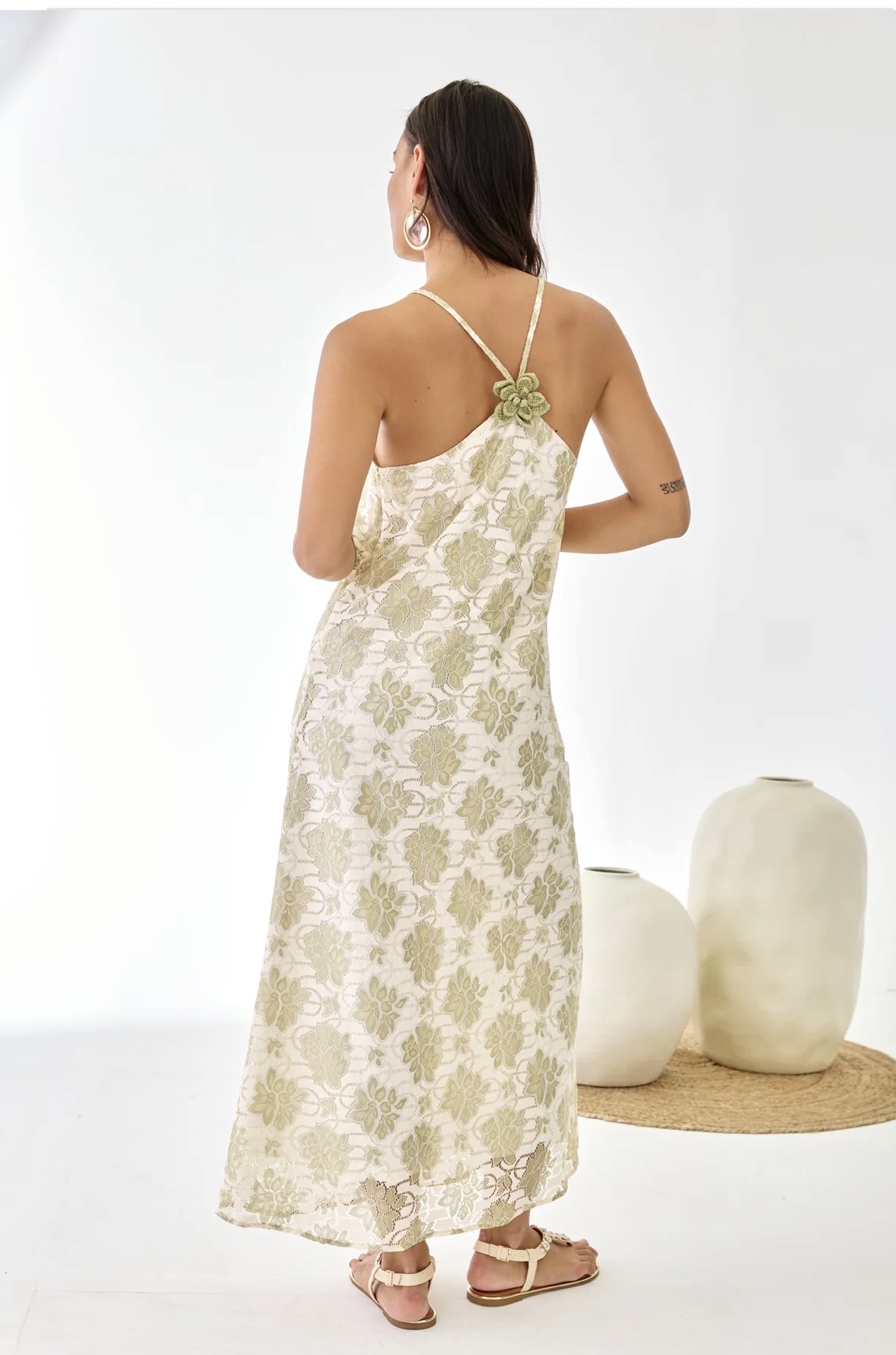 Long lace dress with a contrasting floral pattern. Thin straps. Crochet flower detail on back.