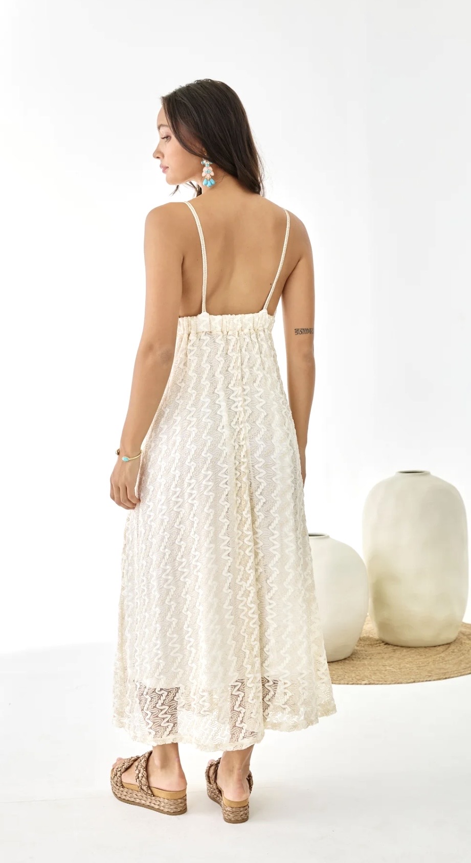 Long lace dress with a contrasting floral pattern. Thin straps. Crochet flower detail on back.